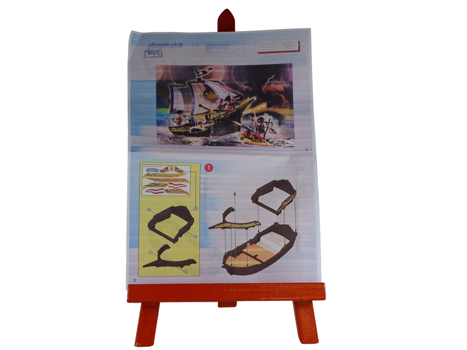 Le pirate, les canons sont différents des originaux. Le mât et la petite voile du radeau ont été échangés par d’autres modèles. Vendu sans la boîte.