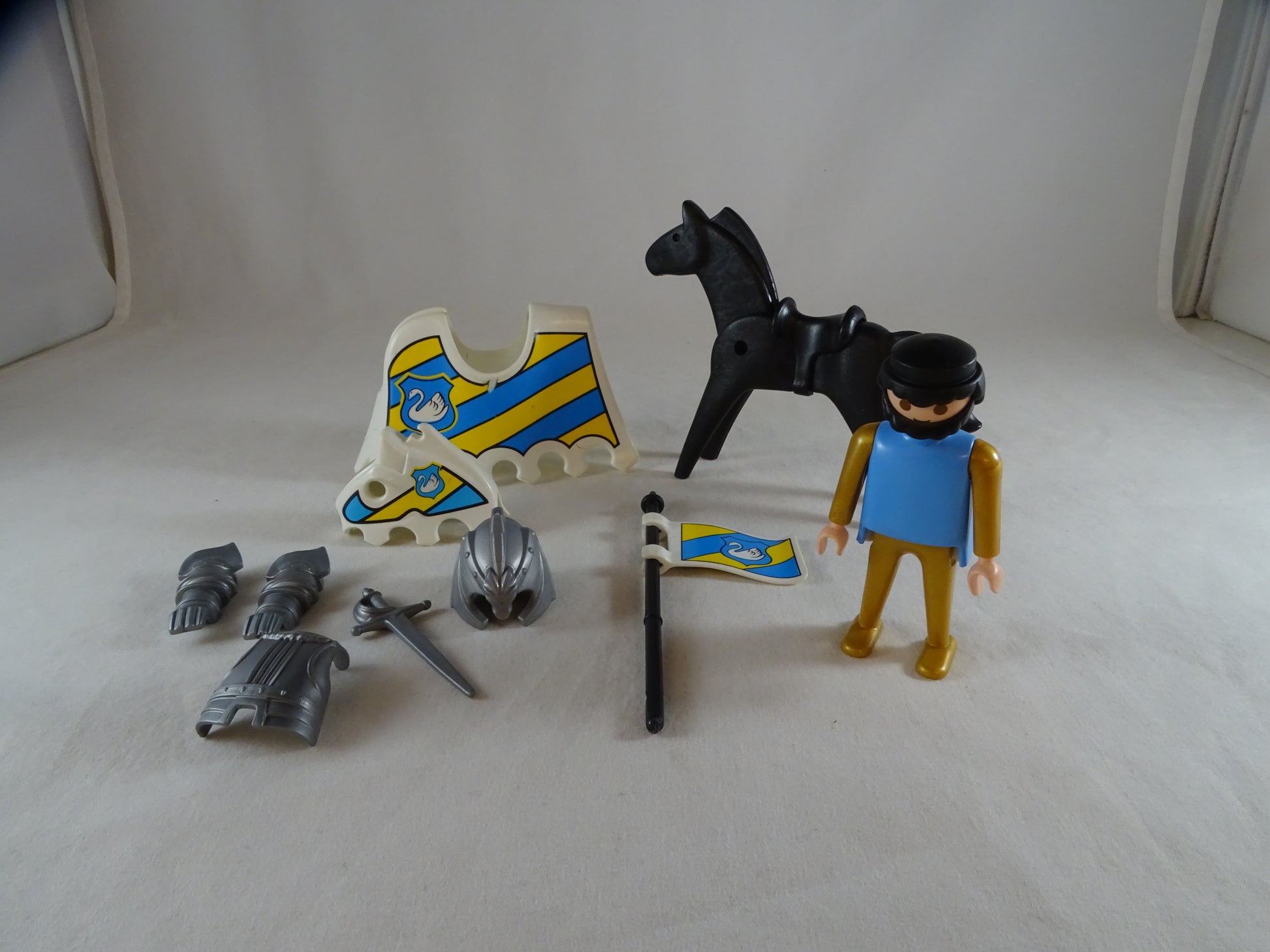 Un chevalier médieval, son cheval et équipement. L’image d’un cygne est présent sur tout son équipement. Geobra de 1974. Certaines pièces ne sont pas d’origines : 1 casque, protections du guerrier, insigne sur protection du cheval.