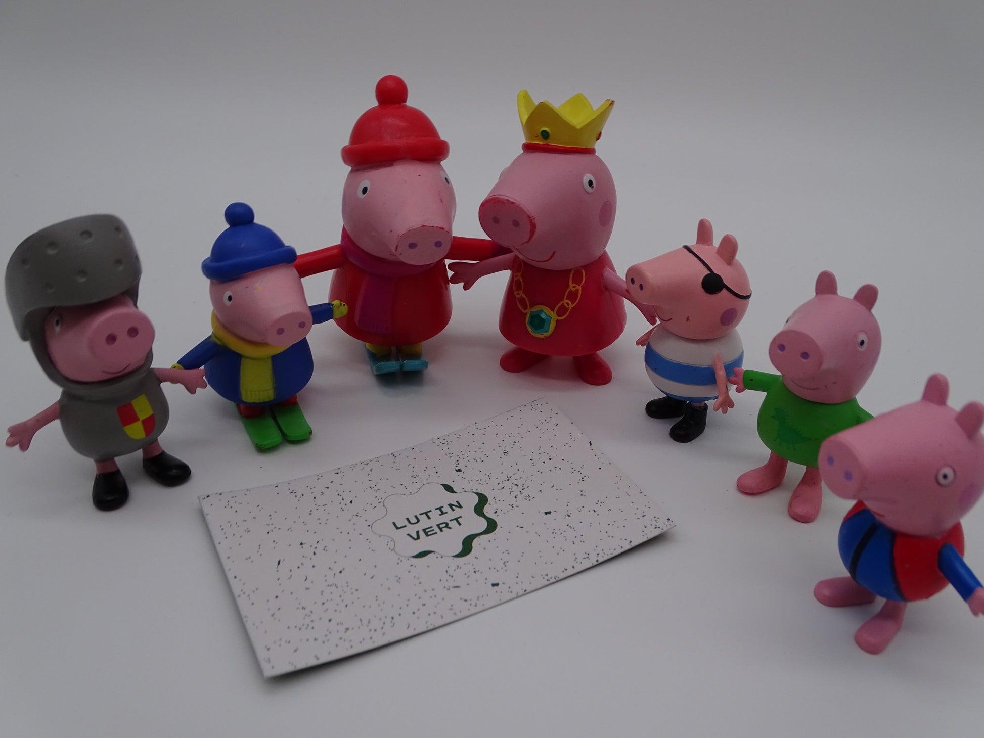 Ce lot contient 7 figurines de l’univers Peppa Pig : Princesse Peppa Pig / Peppa Pig et George au ski / Chevalier George / George pyjama dino / George pirate / George surfeur. Taille : entre 5 cm et 7,5 cm