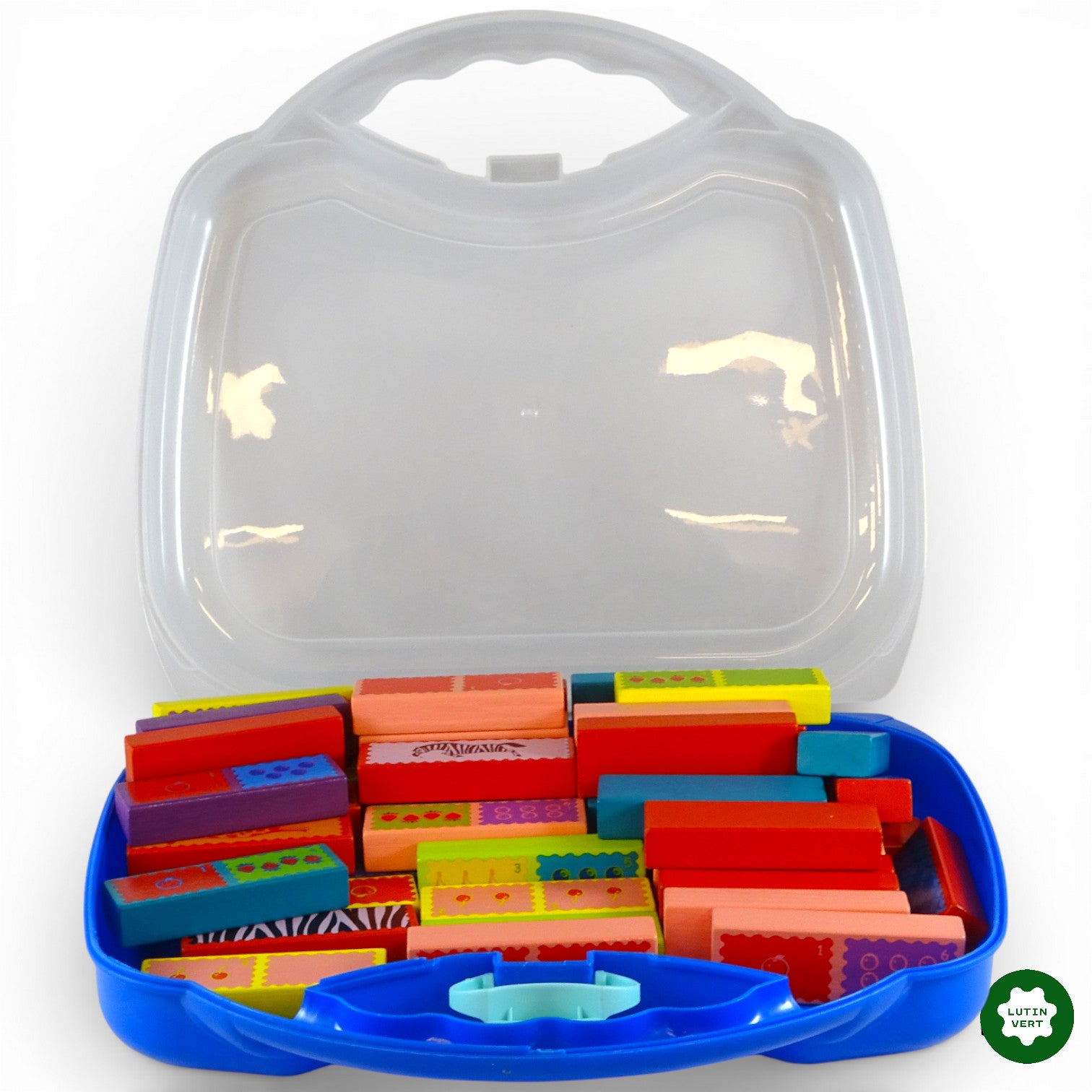 Lot de 52 Blocs colorés en bois, pour jouer aux Dominos, au Memory et réaliser une tour d’équilibre ! Ces jolis blocs colorés stimuleront en douceur la créativité et la réflexion des tout-petits. Contenu : 1 Dé / 52 Blocs en bois