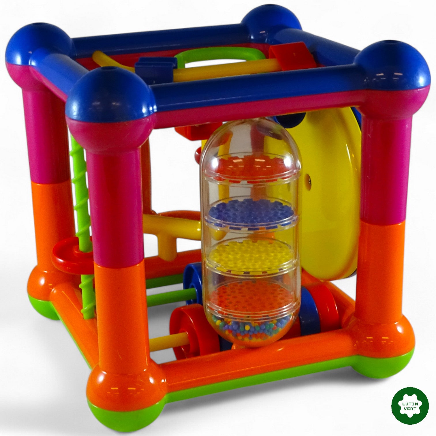 Un cube d’éveil aux premiers sens coloré et proposant diverses activités pour les tout-petits : des anneaux, un petit miroir à faire tourner, des petites billes, etc.
