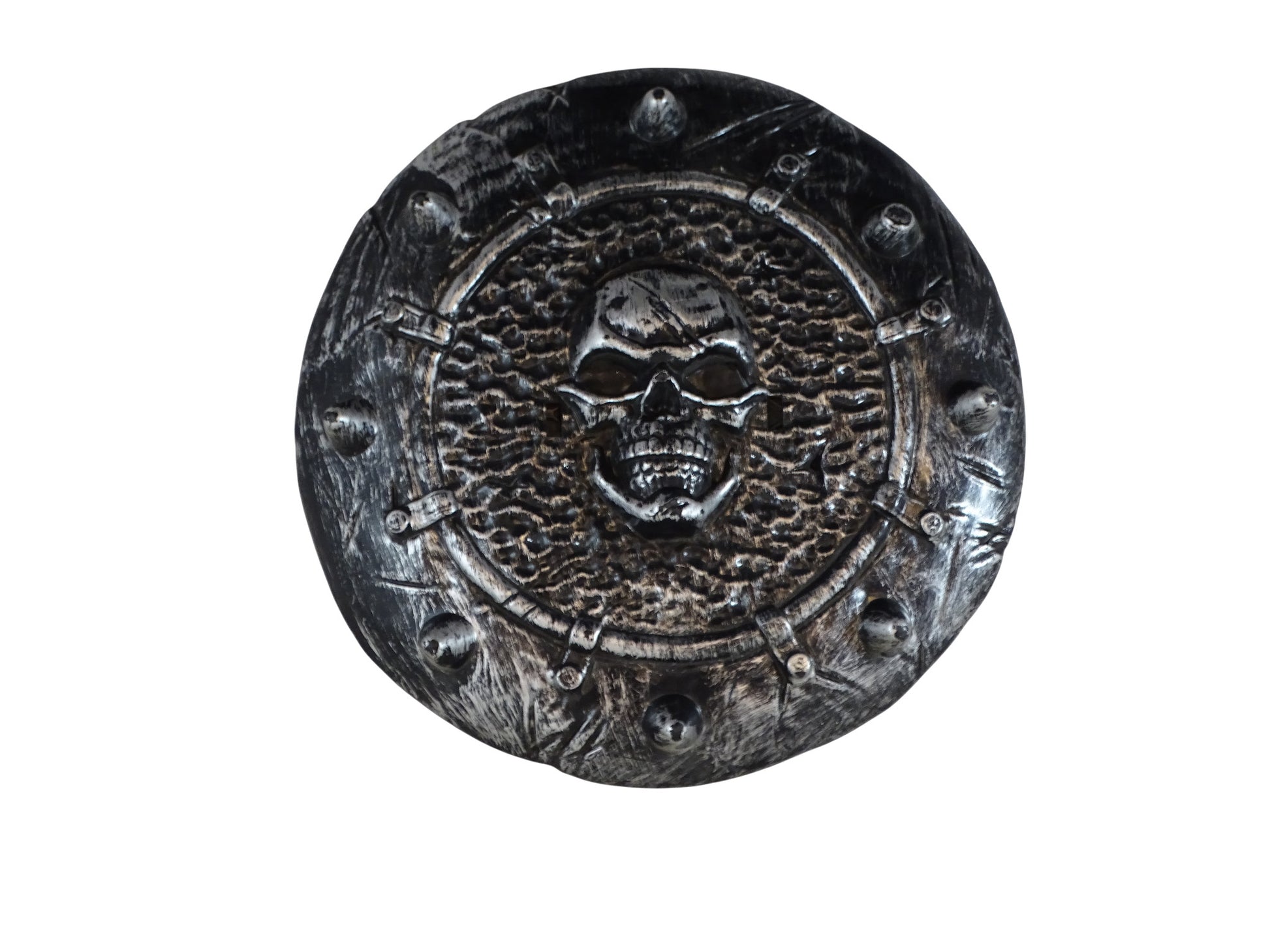 Un bouclier rond en plastique imitation acier (gris-noir) avec des petites pointes sur le contour et un crâne de squelette en son centre. Une petite attache au dos permet de le tenir en main. Diamètre : 30 cm.