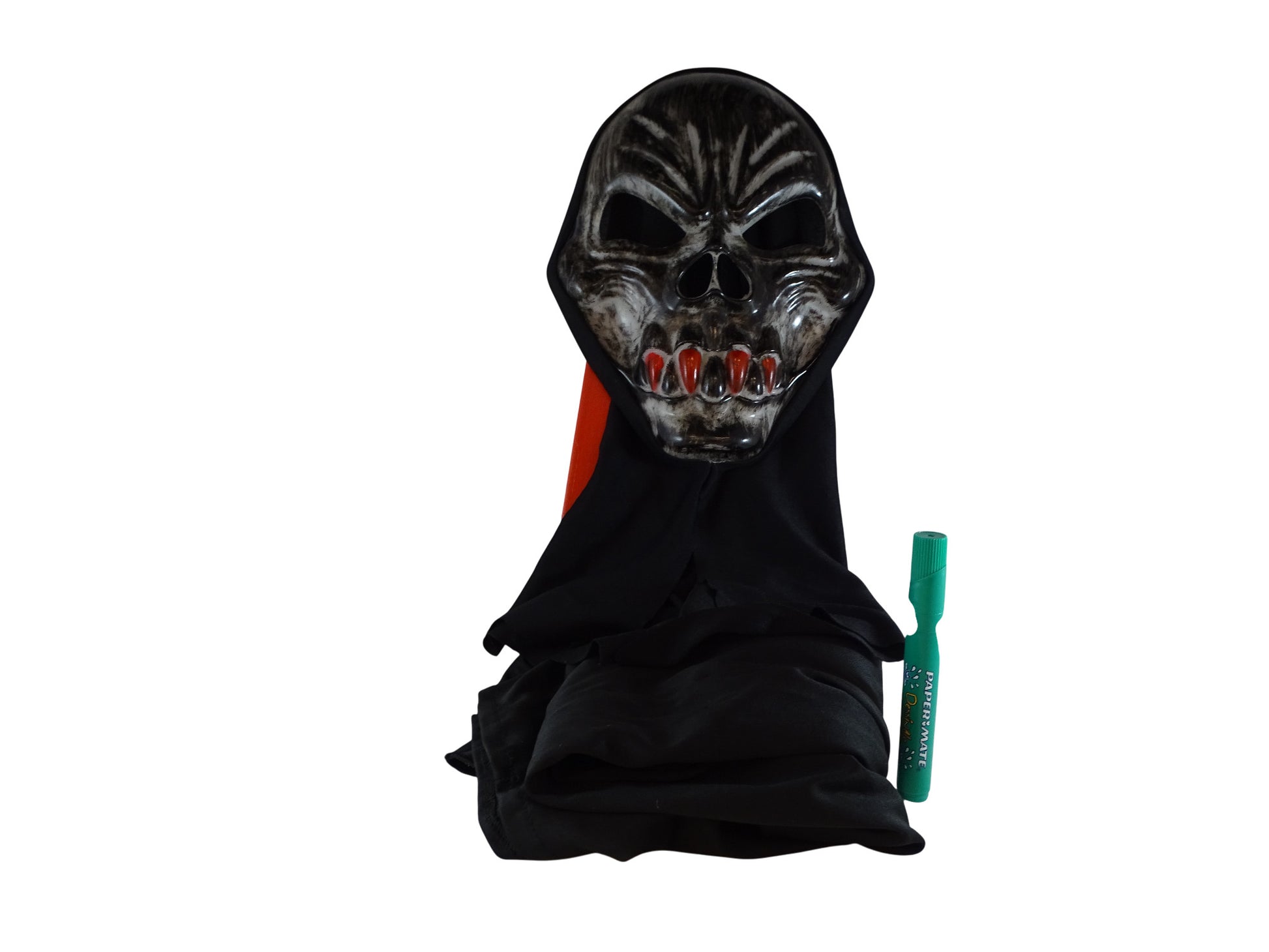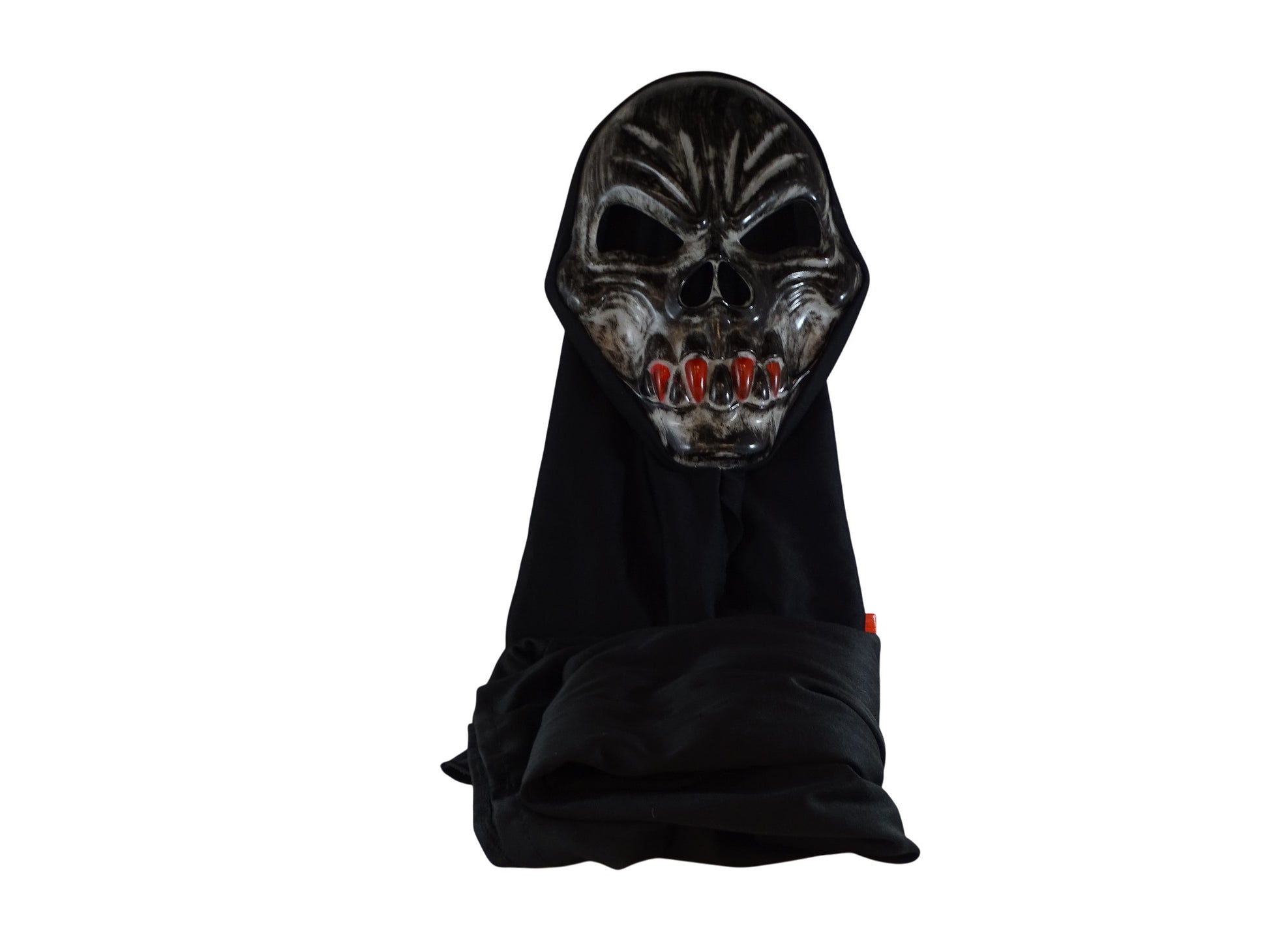 Un masque de squelette avec des terribles crocs, en plastique, avec sa cagoule et une tunique noire unie. Idéal pour Halloween, le carnaval de Mardi-Gras ou pour simplement se déguiser lors de fêtes ou pour des anniversaires costumés. Taille : 90-110 cm / 4-6 ans.