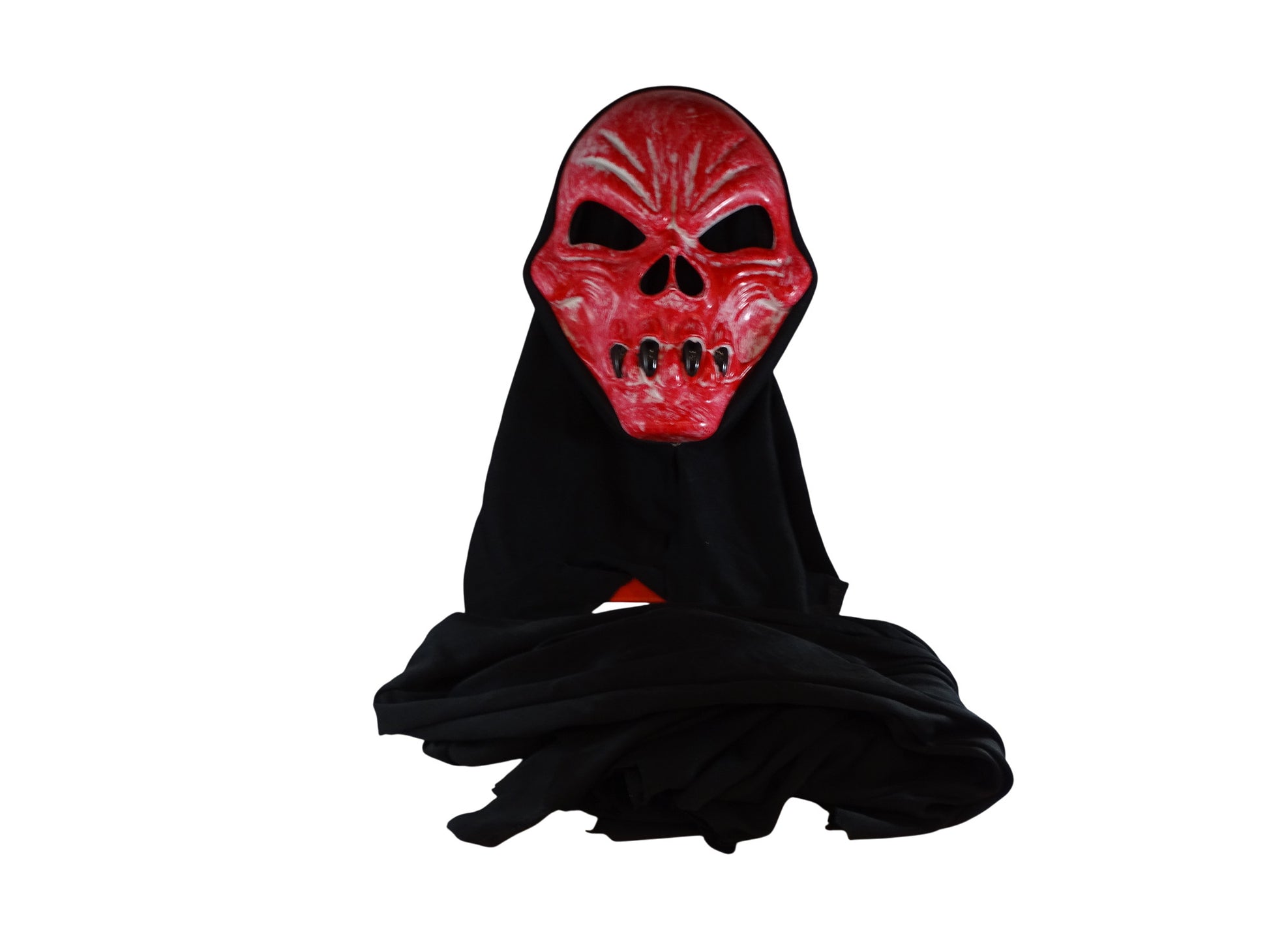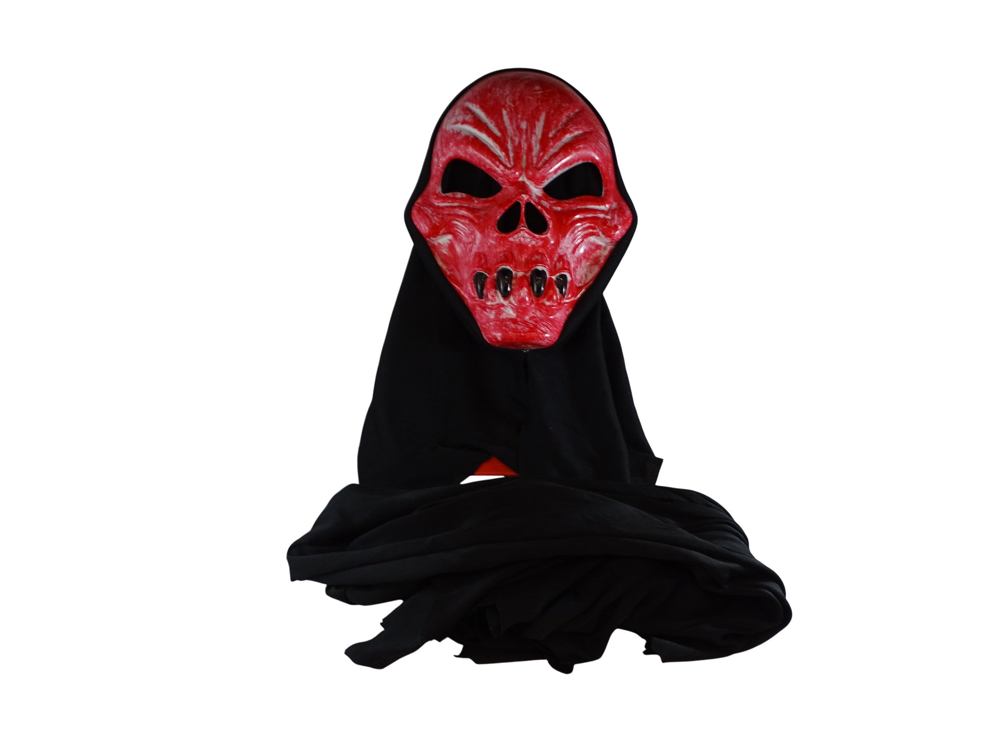 Un masque rouge en plastique, avec une cagoule, représentant une tête de squelette avec de grandes dents pointues. Avec aussi une tunique noire et sa capuches (marque Gifi). Taille (sans la capuche) : 70 cm / 7-10 ans.