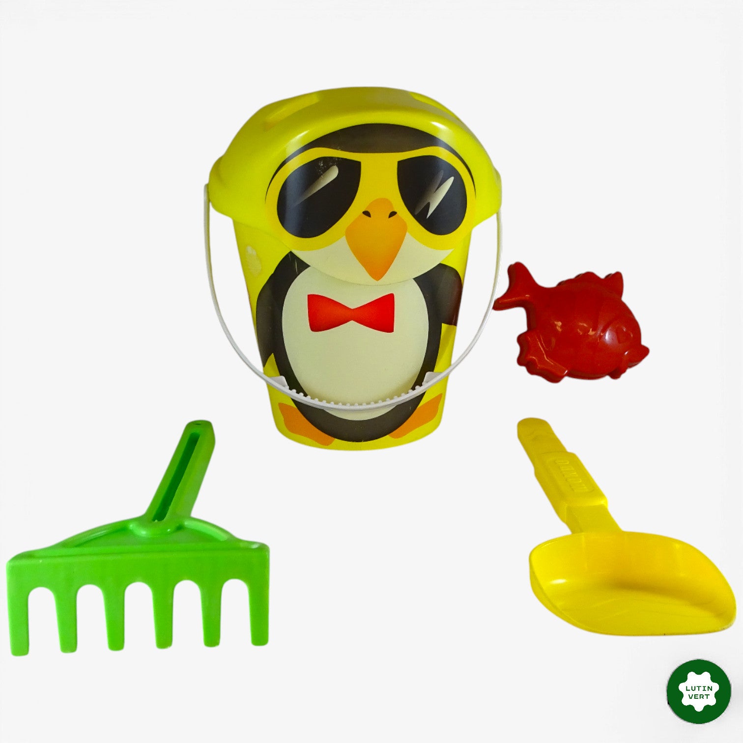 Un seau de plage jaune avec un couvercle en tête de pingouin, avec un râteau, une pelle et un petit moule en forme de poisson.