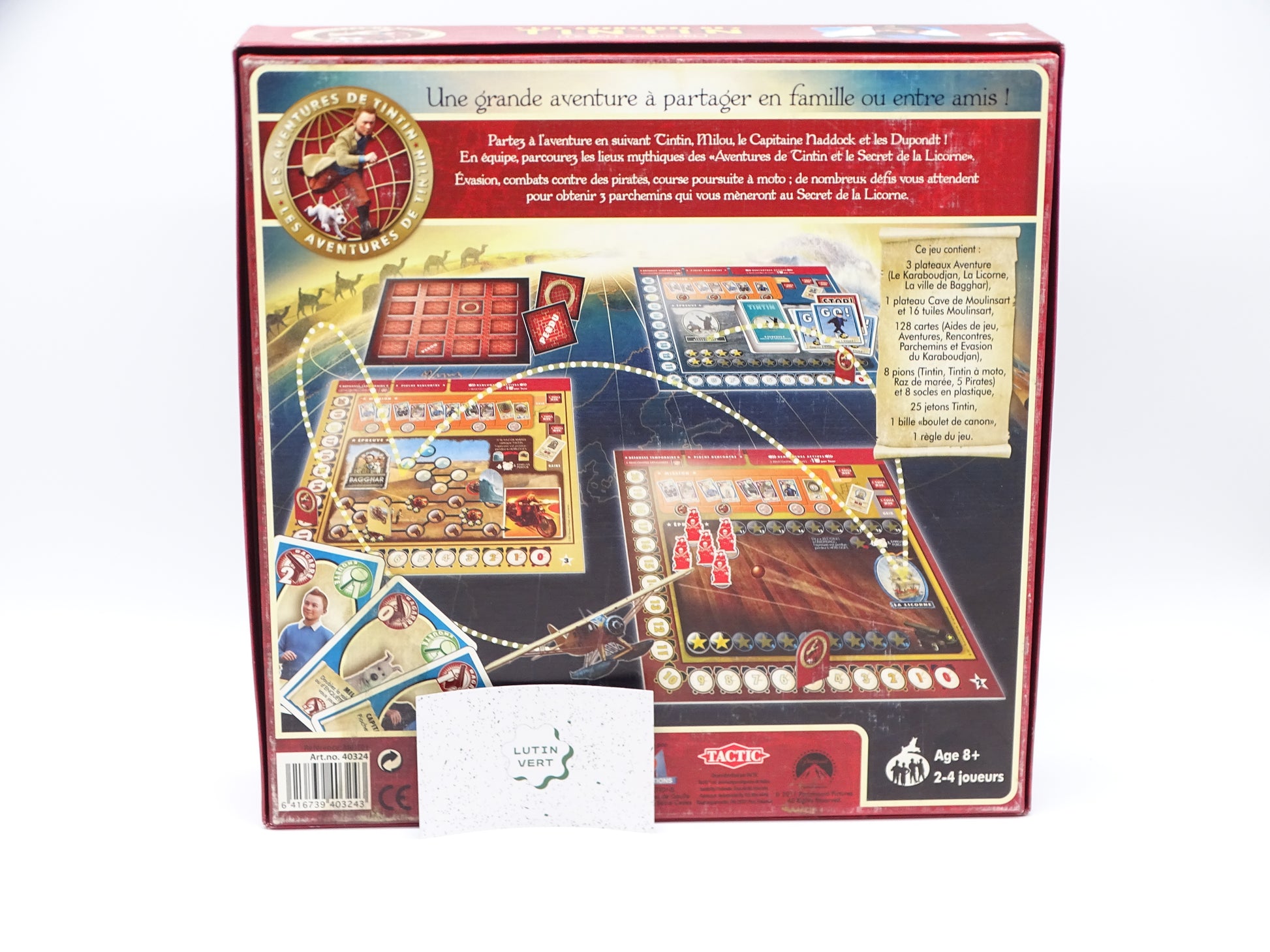 ll s’agit d’un jeu coopératif, dans lequel chacun incarne un personnage emblématique comme Tintin, Milou ou le capitaine Haddock. Ensemble, les joueurs doivent résoudre des énigmes, surmonter des épreuves et récupérer des parchemins afin de découvrir le trésor de Rackham le Rouge. Le jeu se distingue par ses règles évolutives et sa structure en plusieurs épisodes, qui permettent de suivre une aventure progressive rappelant le déroulement du film. Accessible et familial, « Les Aventures de Tintin » met l’accent sur la coopération, la réflexion et l’immersion dans un univers d’enquête et d’aventure, ce qui en fait un jeu idéal pour les amateurs de la bande dessinée comme pour les joueurs occasionnels Contenu : 4 Plateaux / 128 cartes / 8 Pions / 25 Jeton / 1 bille / 1 notice 8 ans et + / 2 à 4 joueurs