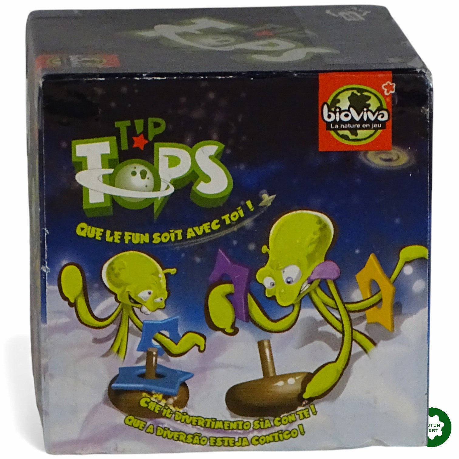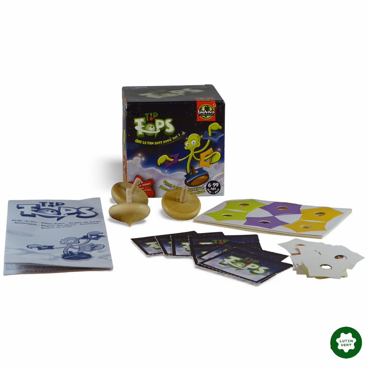 Les toupies sont lancées. Placez les étoiles de couleur sur les toupies avec rapidité et stratégie. Qui réalisera la bonne combinaison de couleurs ? La marque Bioviva conçoit ses jouets dans le respect de la nature et de l’Homme. 2 à 5 joueurs / 6 ans et plus / 10 mn
