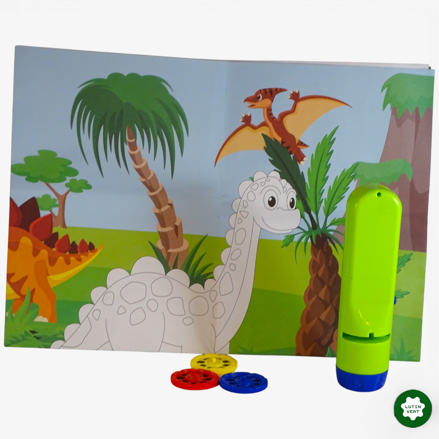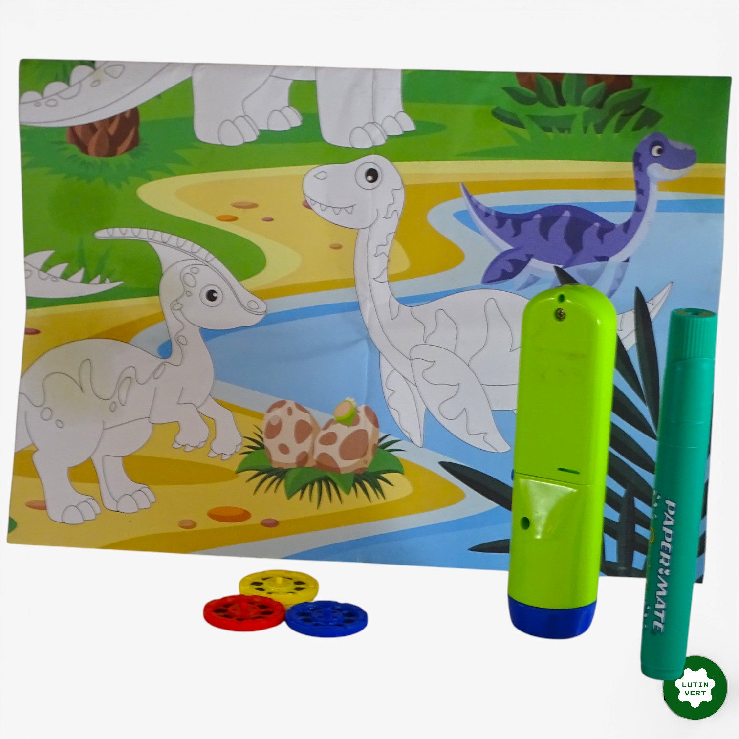 Une petite projectionneuse en forme de lampe-torche qui permet d’afficher 24 images de dinosaures avec 3 petits disques de 8 images chacun.